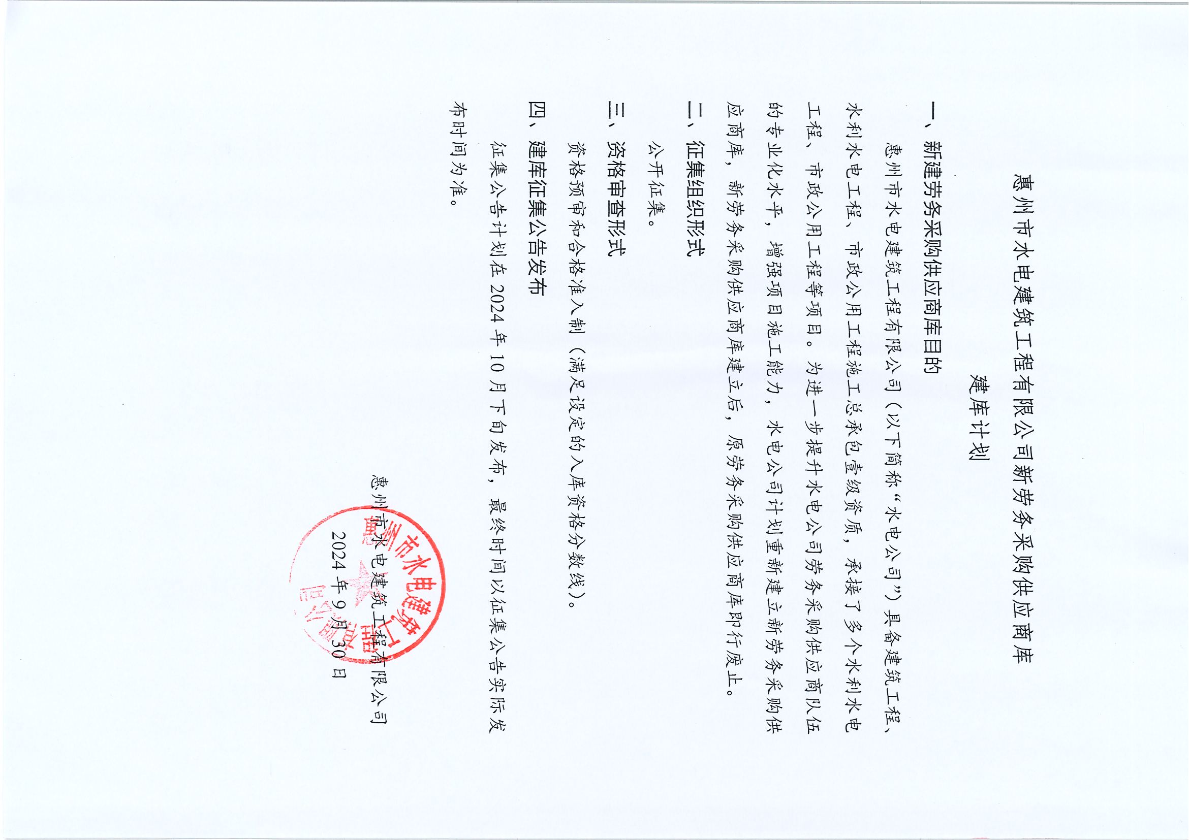 惠州市水電建築工程有限公司新勞務採購供應商庫建庫計劃
