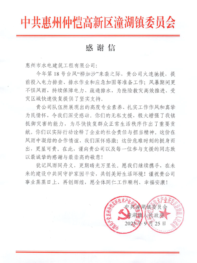 9月26日,仲恺高新區潼湖鎮政府向水電公司發來感謝信,來信指出,水電公司在第18号台風“桦加沙”來襲之際,火速馳援,提前投入電力排查、排水作業和應急加固等準備工作;風暴期間更不懼風雨,持續保障電力、疏通排水,爲搶險救災高效推進、受災區域快速恢複提供瞭堅實支持,體現瞭高度專業素養、紮實工作作風和真摯爲民情懷。