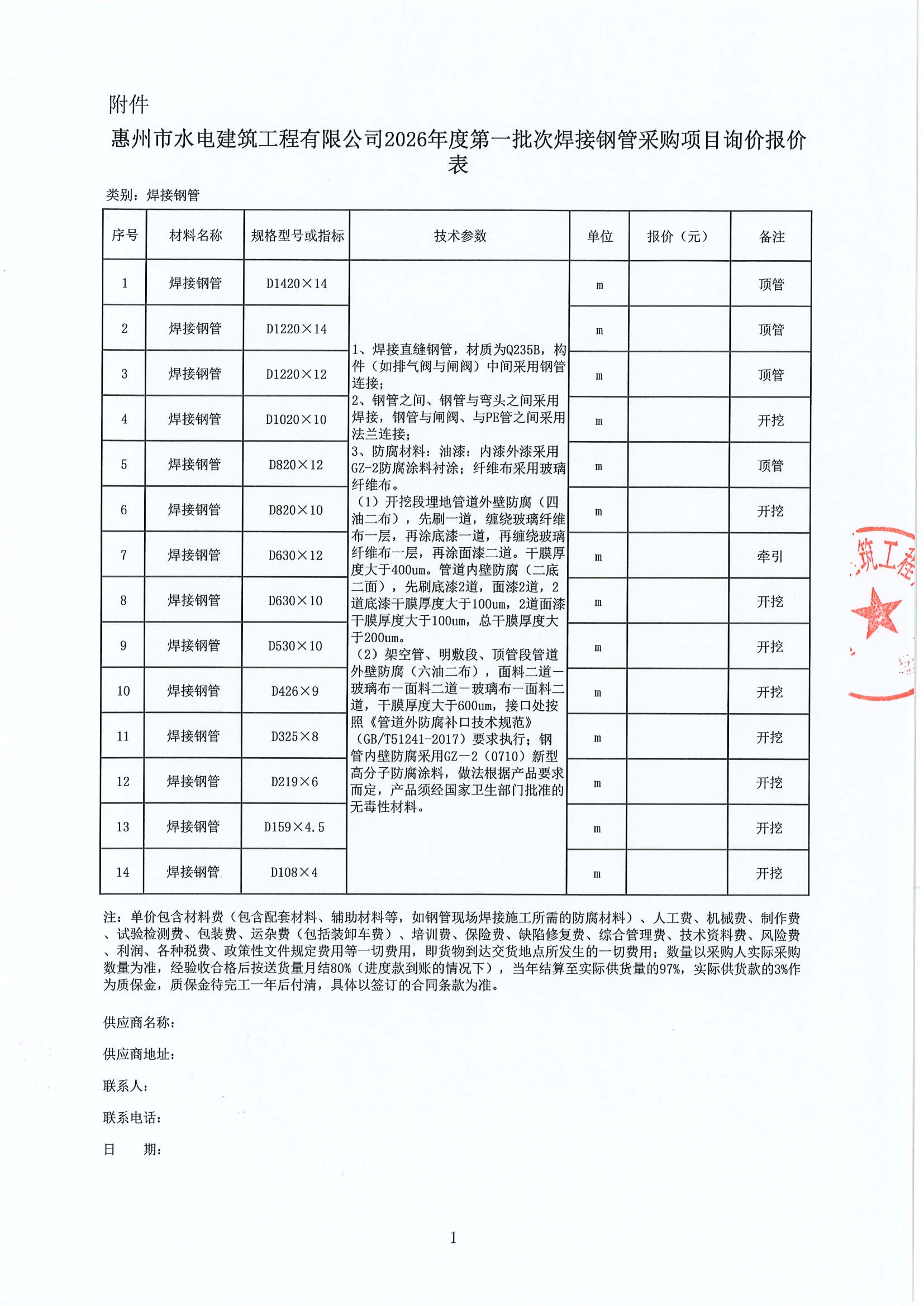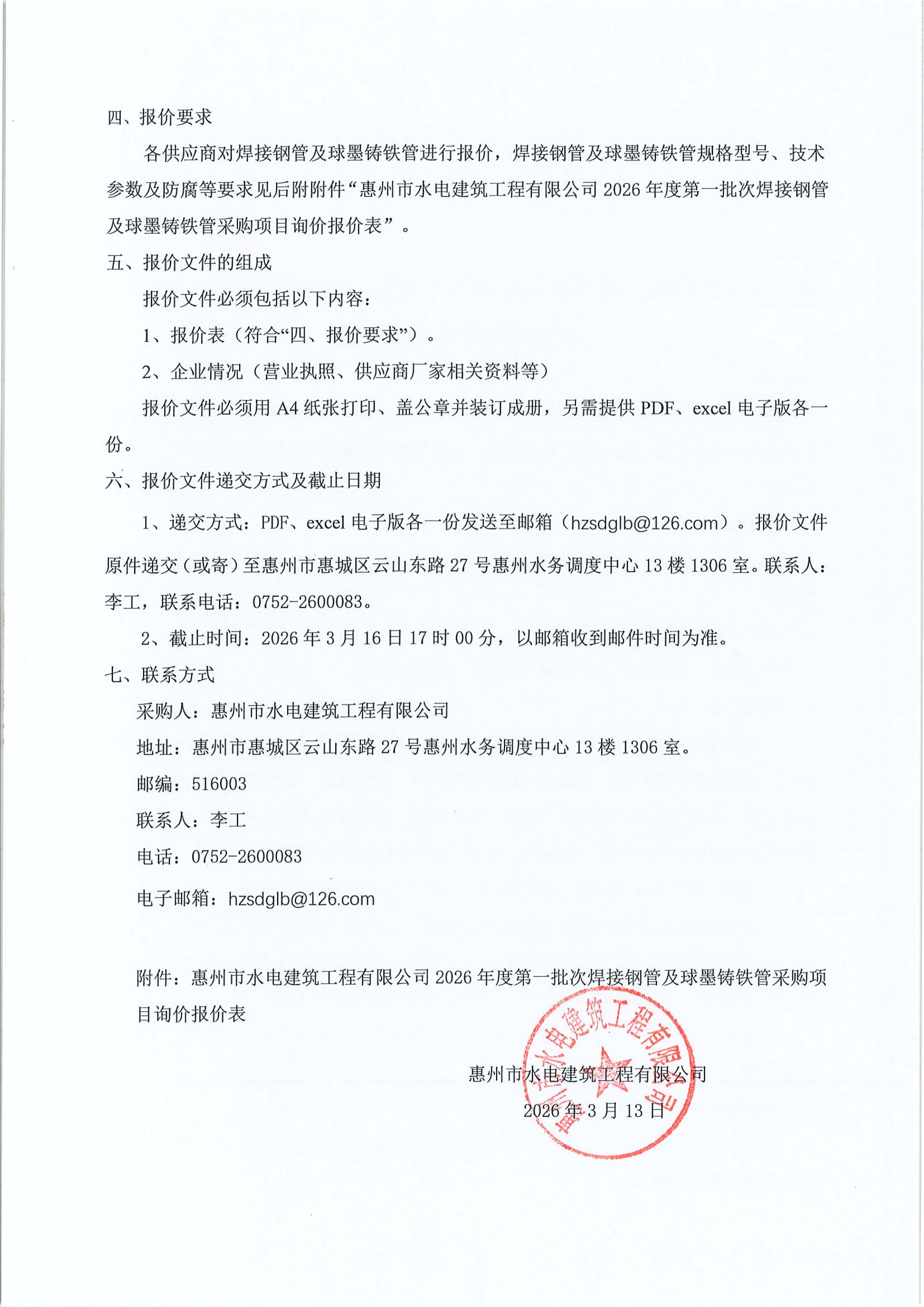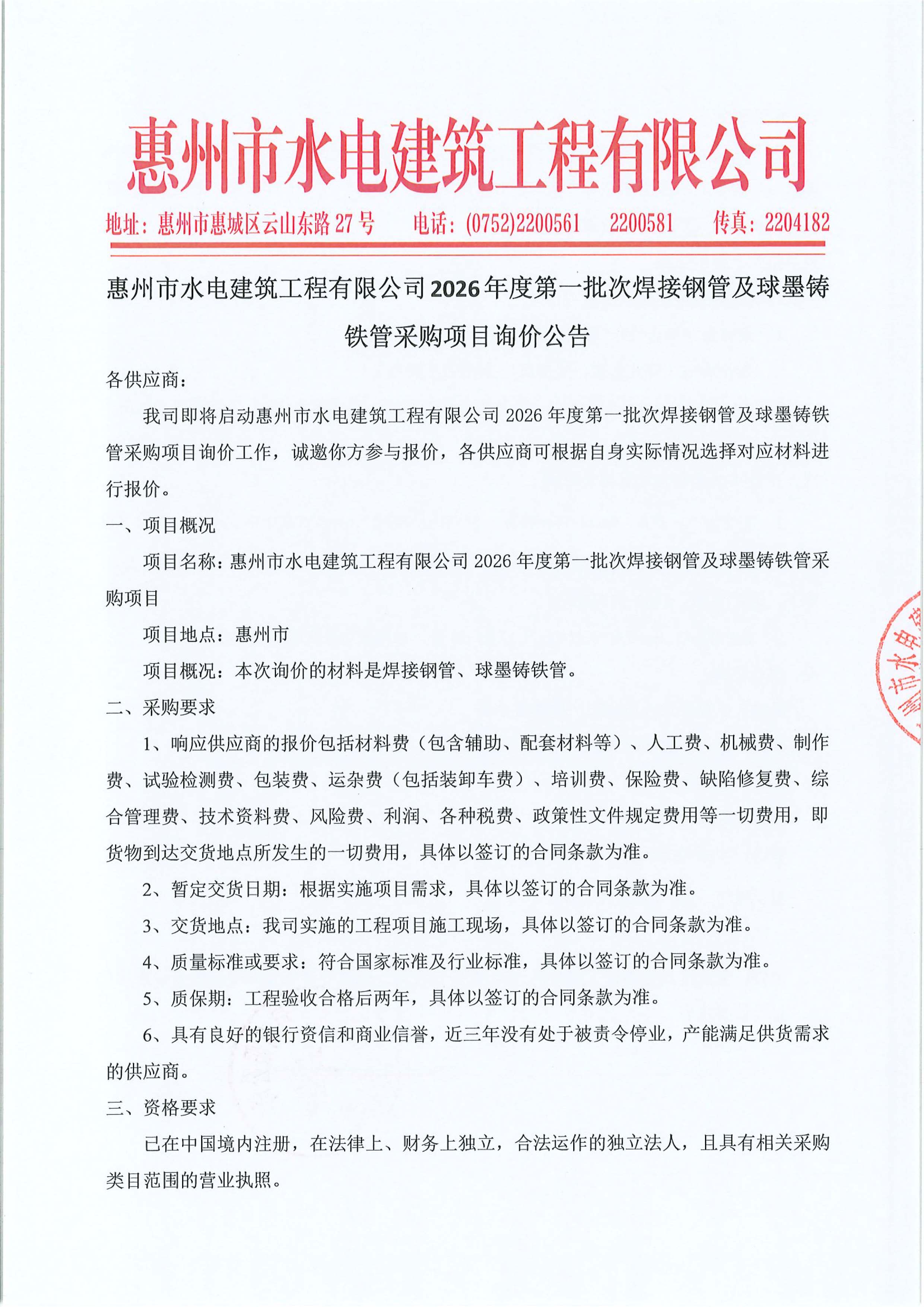 惠州市水電(diàn)建築工程有限公司2026年度第一批次焊接鋼管及球墨鑄鐵管採(cǎi)購項目詢價公告附件: