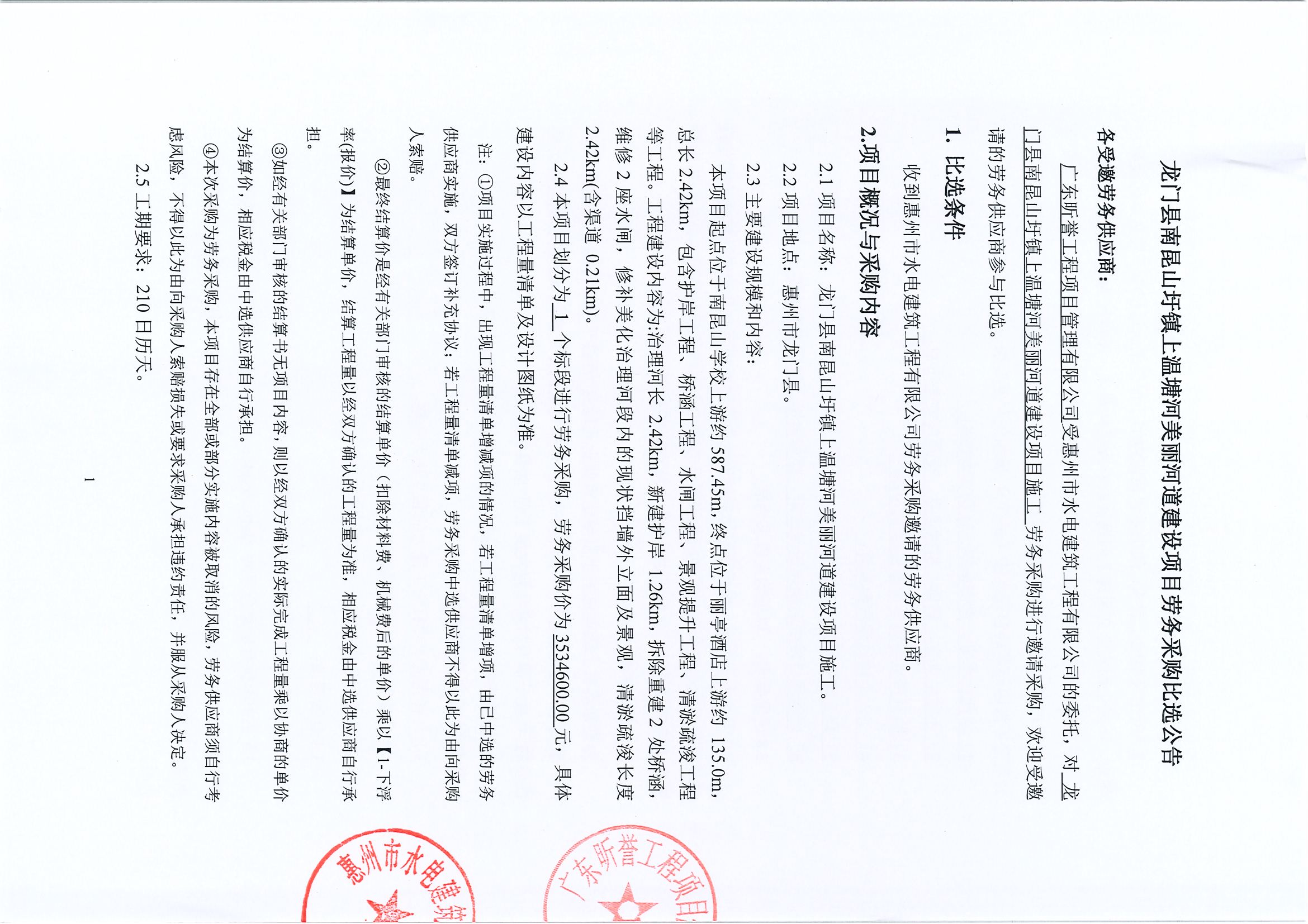 龍門縣南昆山圩鎮上溫塘河美麗河道建設項目勞務採購比選公告