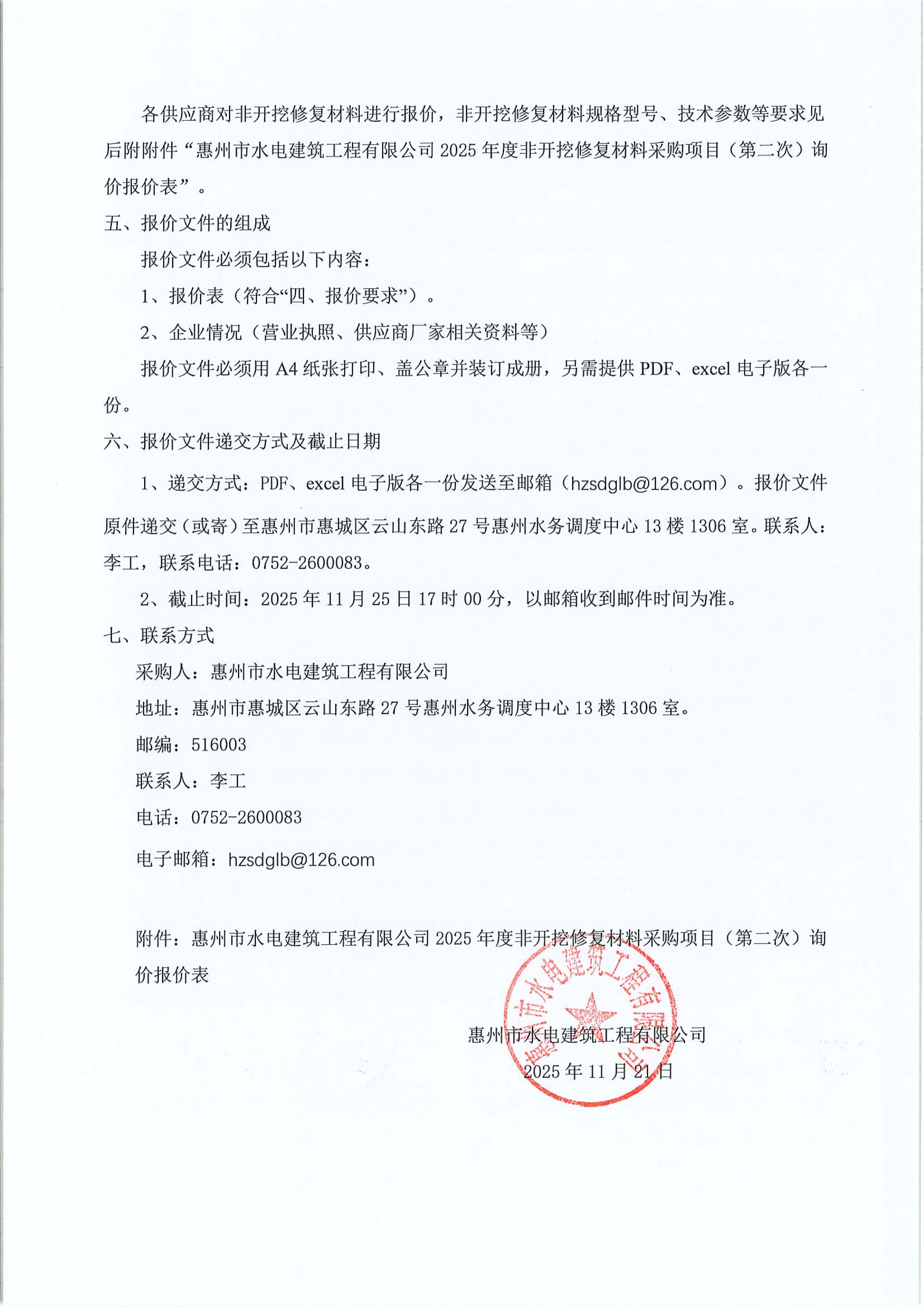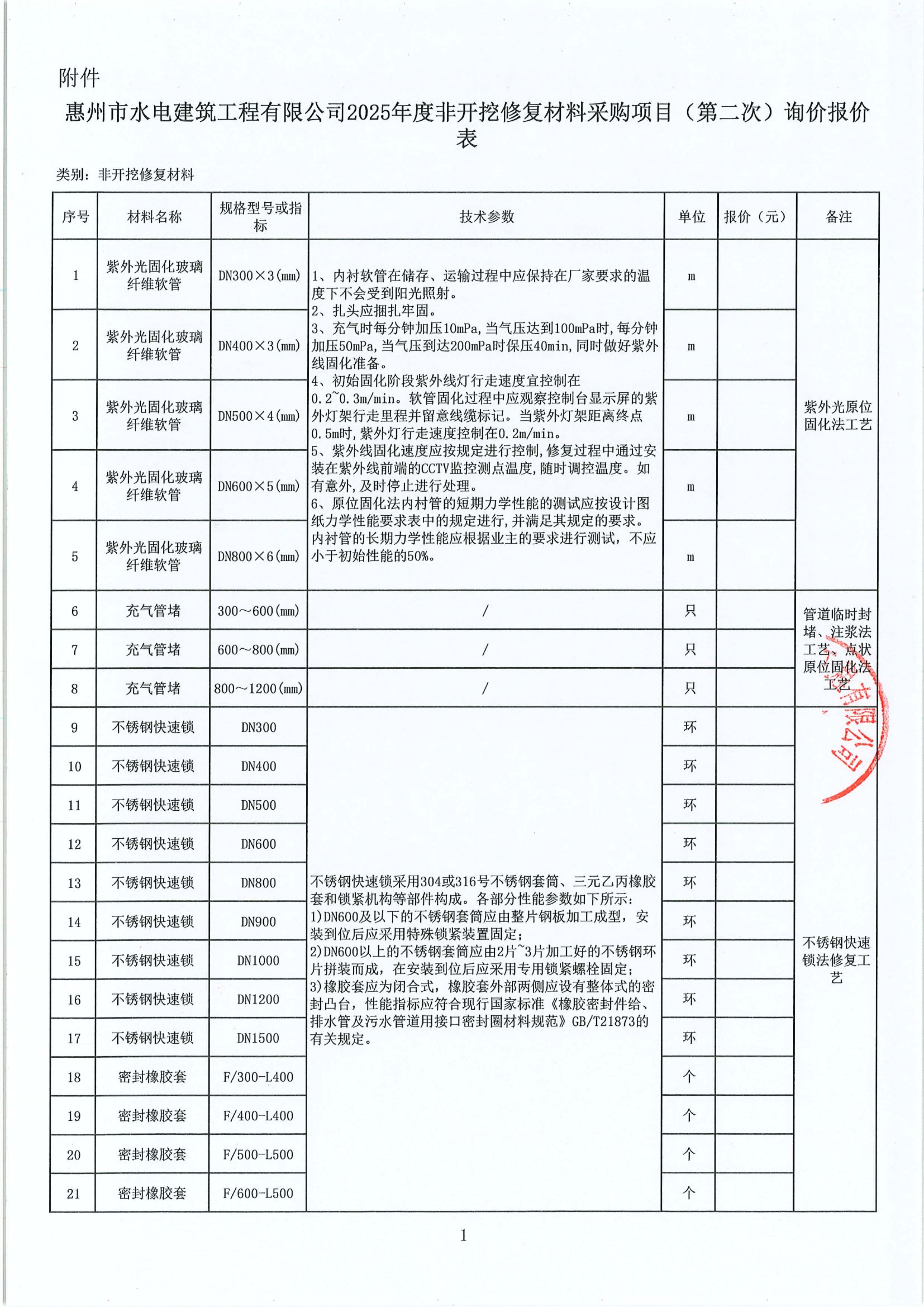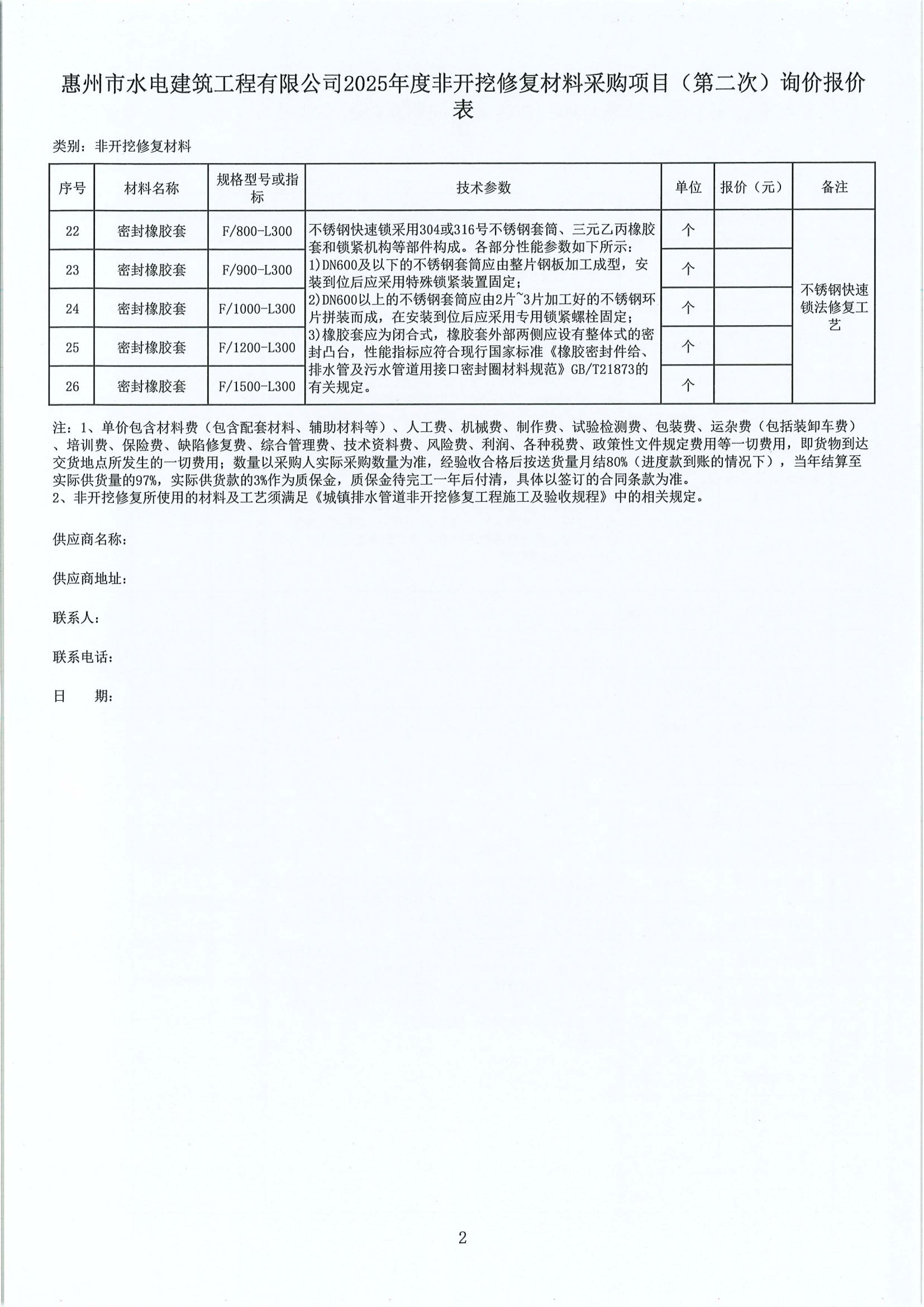 惠州市水電(diàn)建築工程有限公司2025年度非開挖修複材料採(cǎi)購項目(第二次)詢價公告附件:
