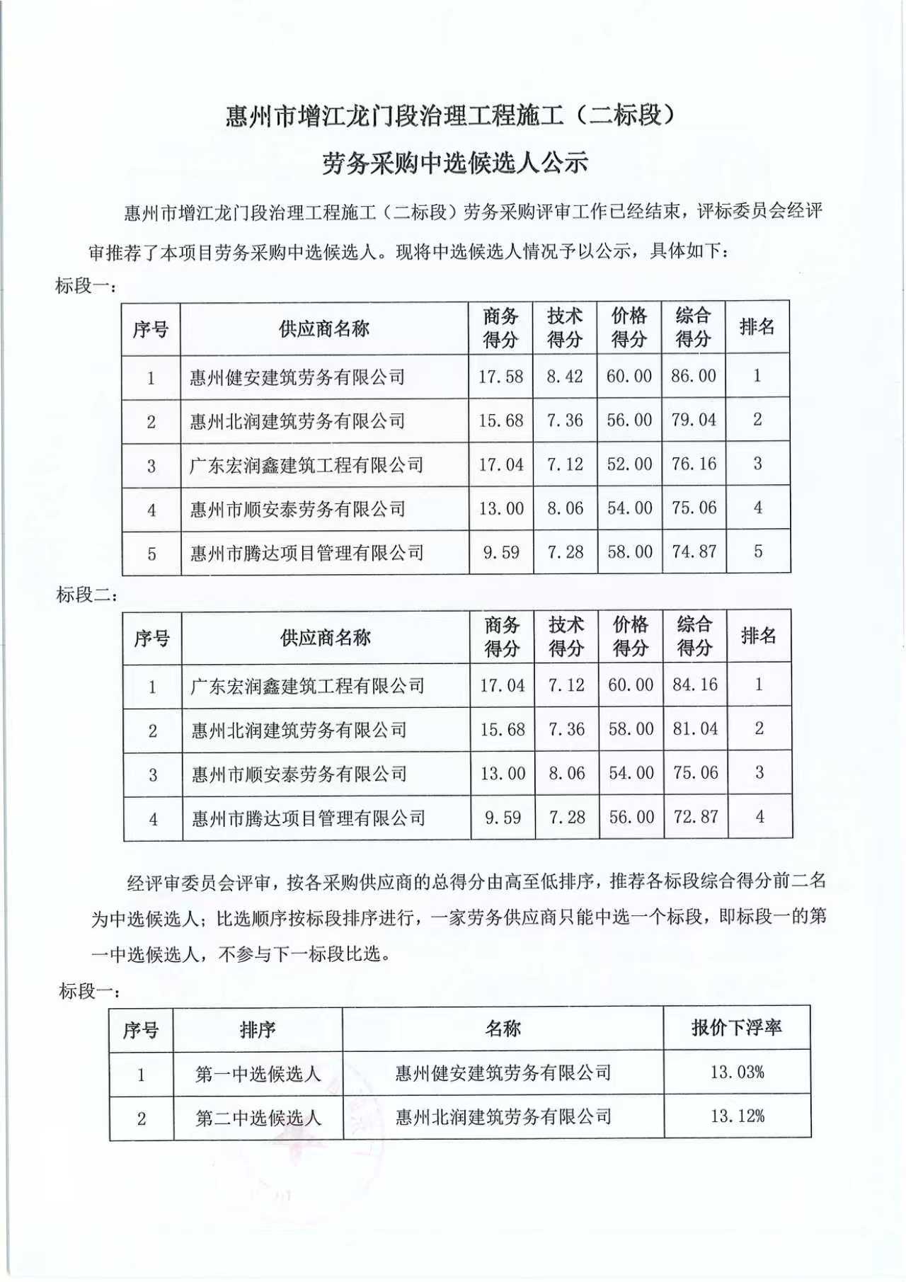 惠州市增江龍門段治理工程施工(二标段)勞務採購中選候選人公示