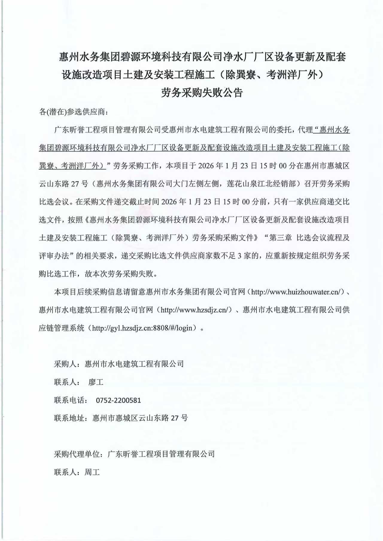 惠州水務集團碧源環境科技有限公司淨水廠廠區設備更新及配套設施改造項目土建及安裝工程施工(除巽寮、考洲洋廠外) 勞務採購失敗公告