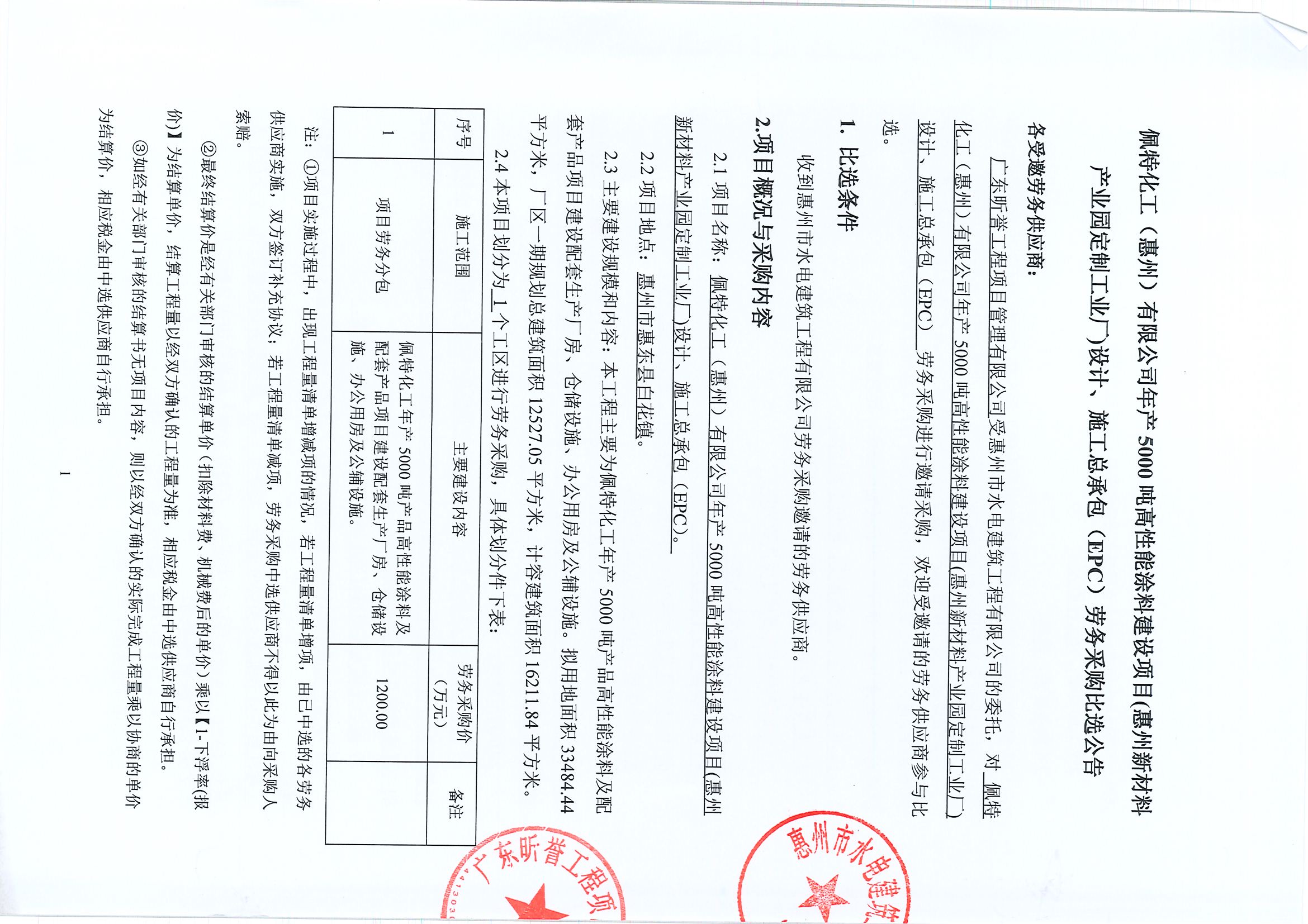 佩特化工(惠州)有限公司年産5000噸高性能塗料建設項目(惠州新材料産業園定制工業廠)設計、施工總承包(EPC)勞務採購比選公告