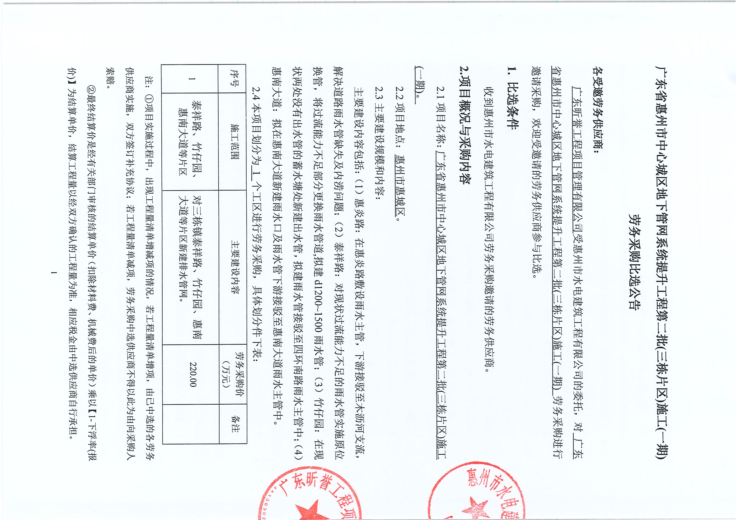 廣東省惠州市中心城區地下管網系統提升工程第二批(三棟片區)施工(一期)勞務採購比選公告