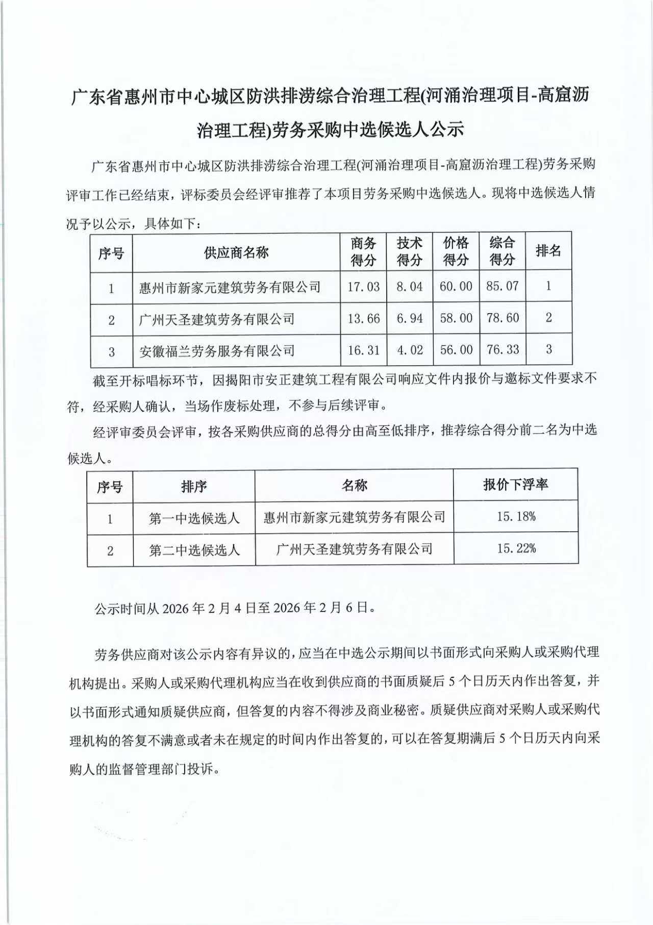 廣東省惠州市中心城區防洪排澇綜合治理工程(河湧治理項目-高窟瀝治理工程)勞務採購中選候選人公示