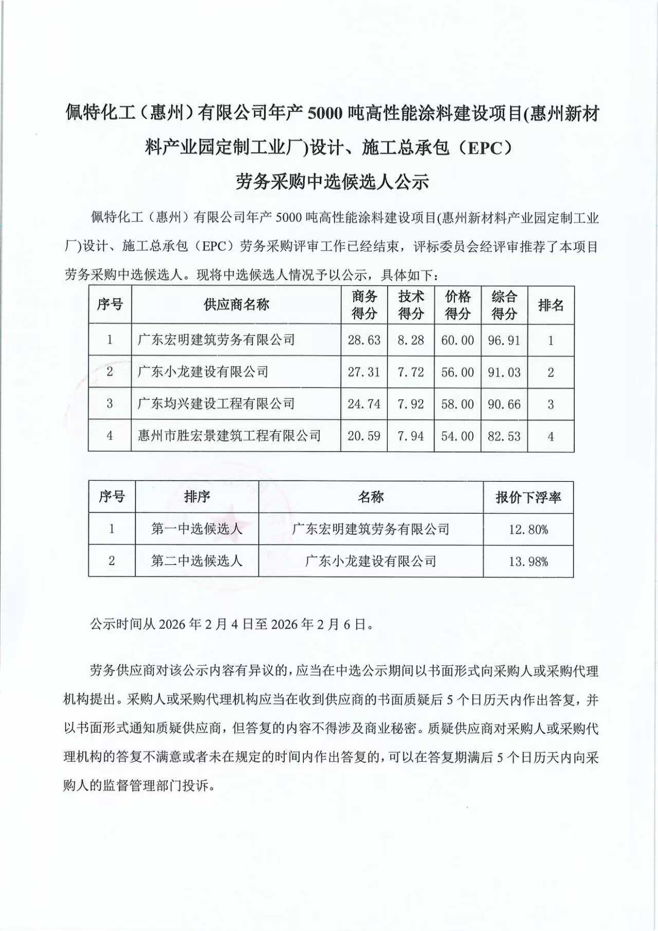 佩特化工(惠州)有限公司年産5000噸高性能塗料建設項目(惠州新材料産業園定制工業廠)設計、施工總承包(EPC)勞務採購中選候選人公示
