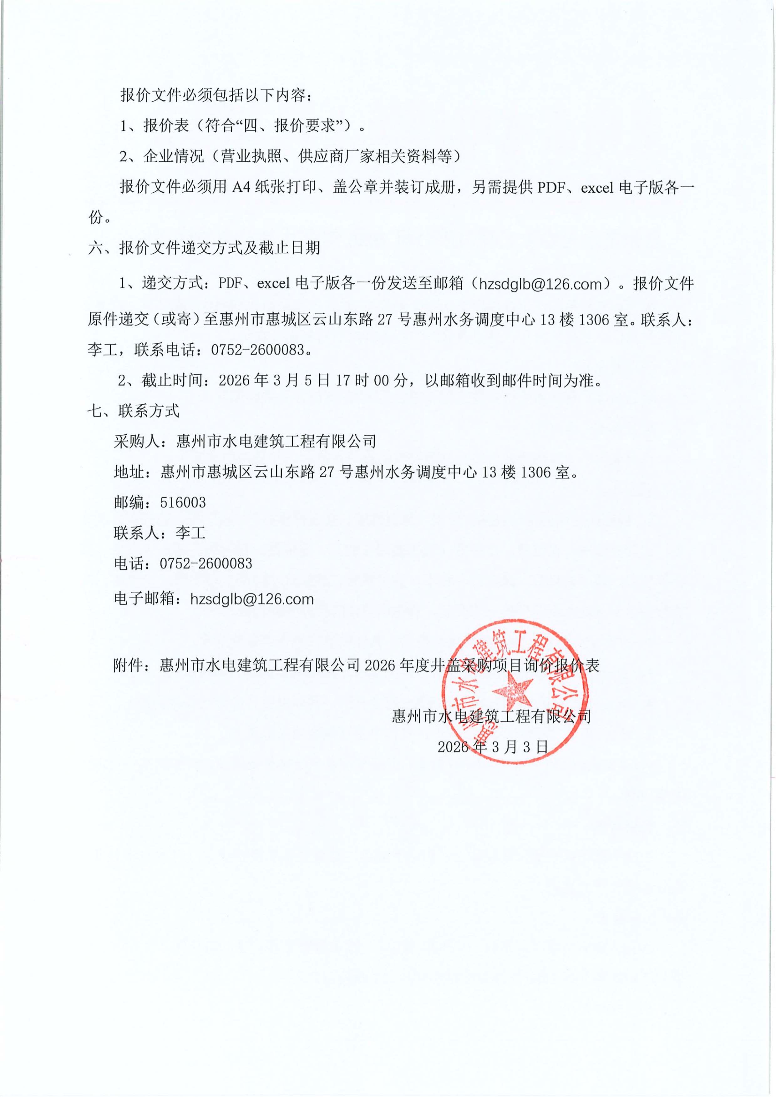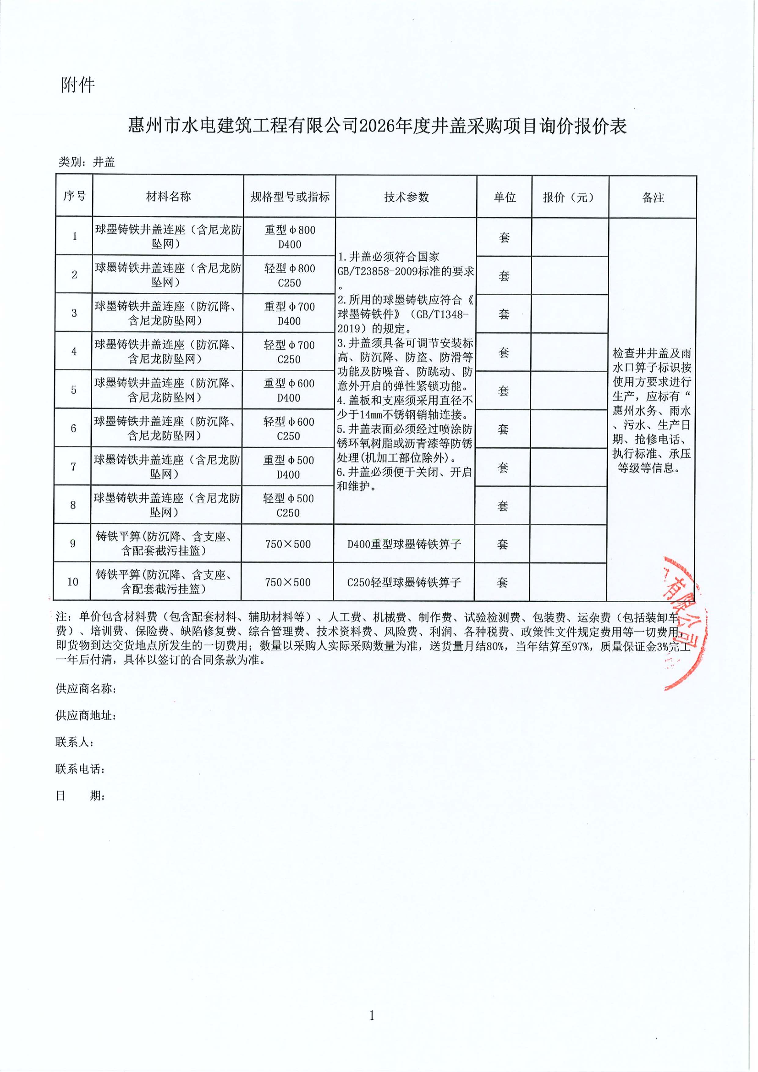 惠州市水電建築工程有限公司2026年度井蓋採購項目詢價公告附件: