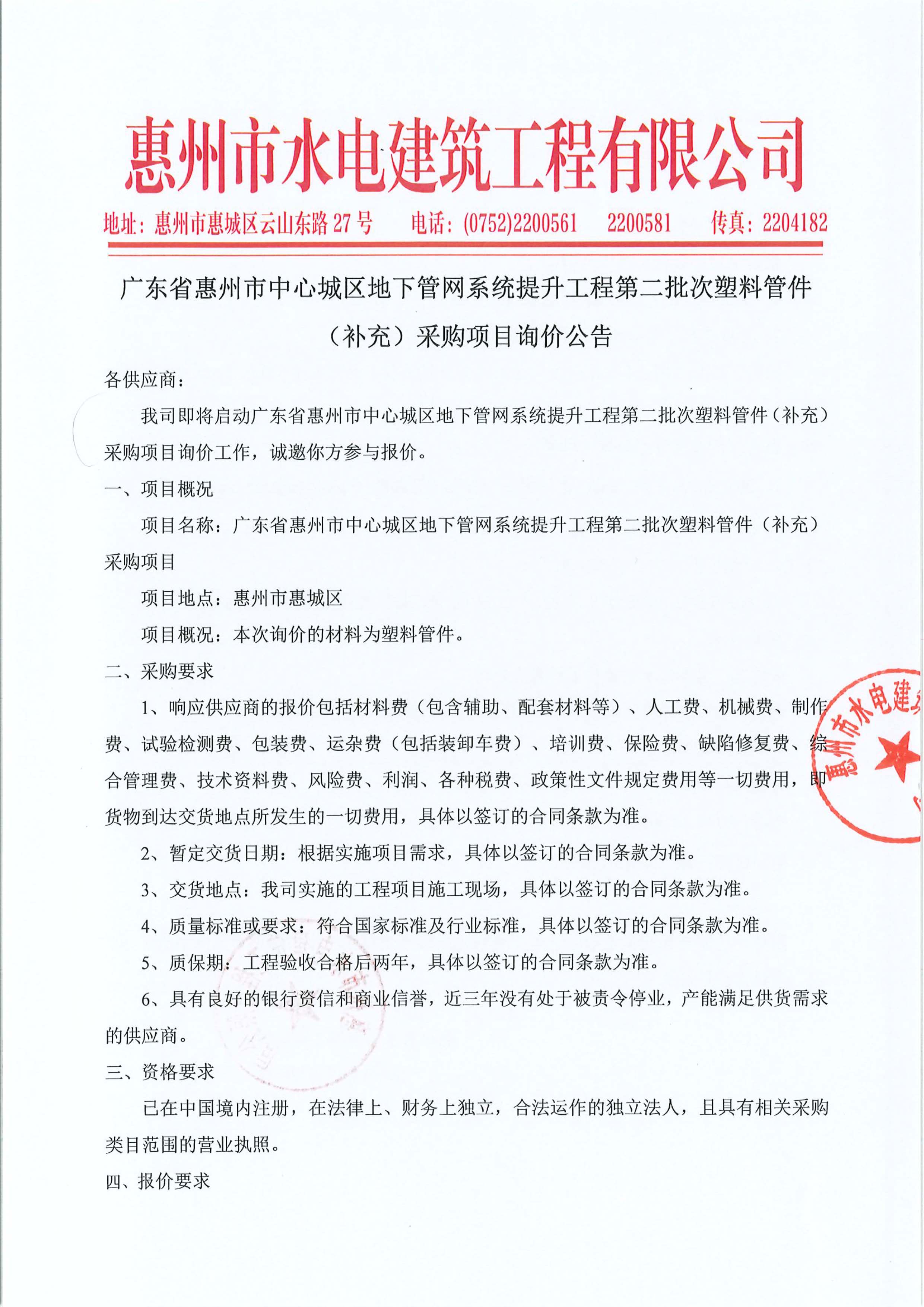 廣東省惠州市中心城區地下管網系統提升工程第二批次塑料管件(補充)採購項目詢價公告