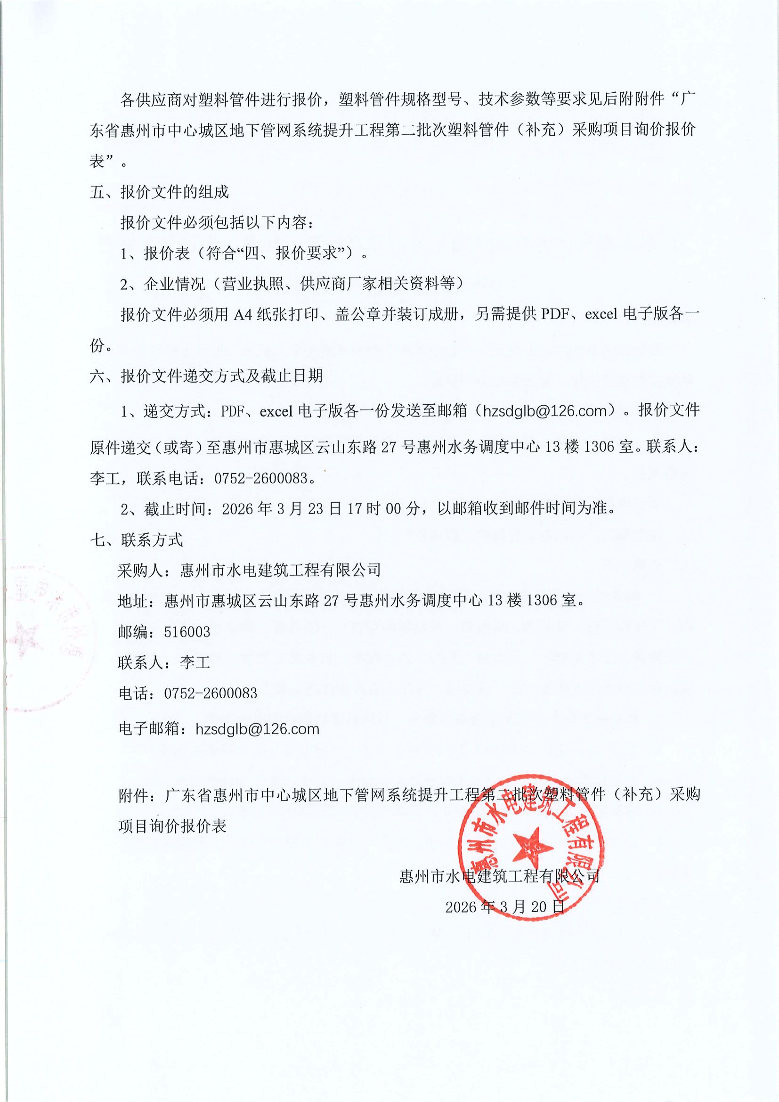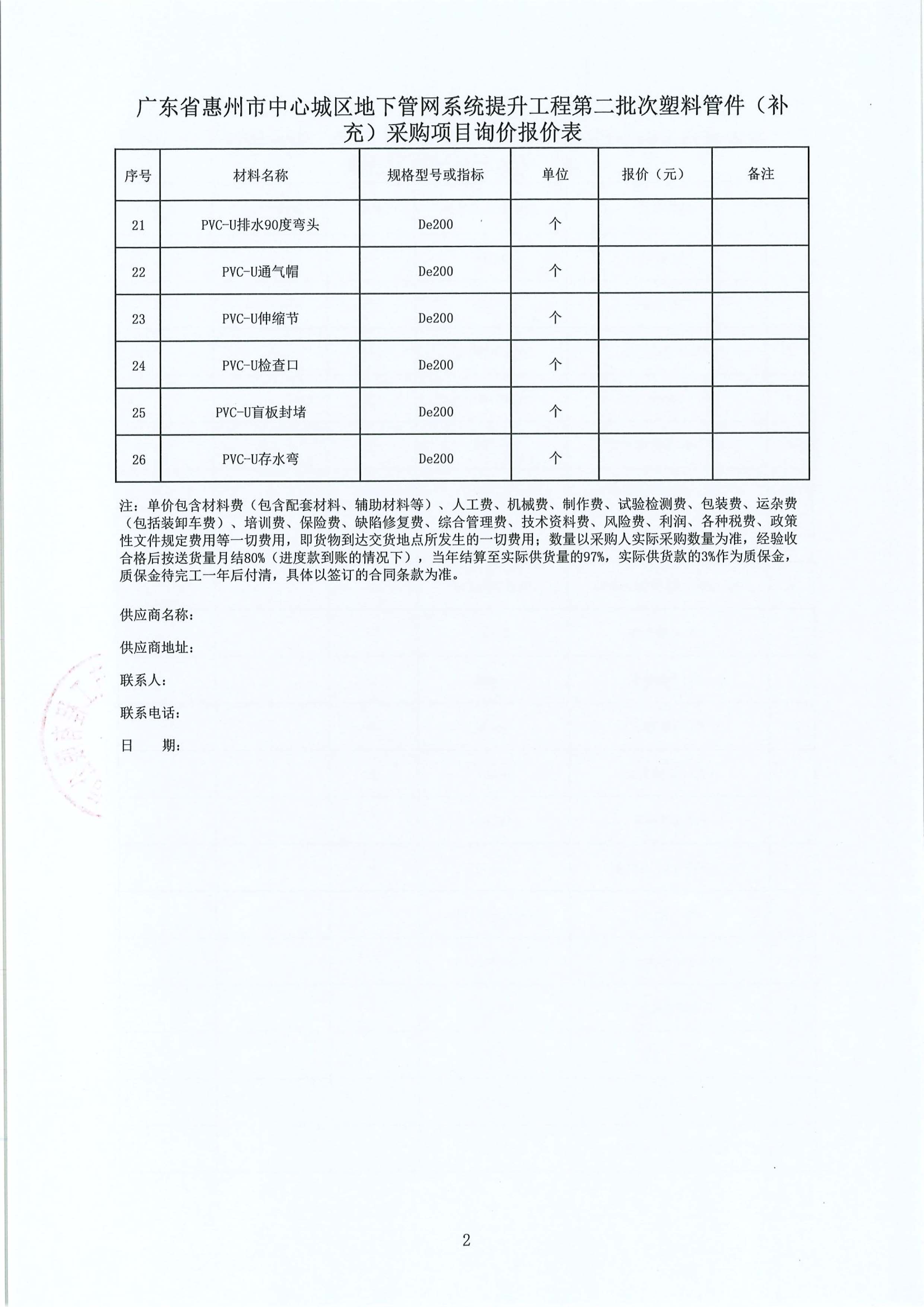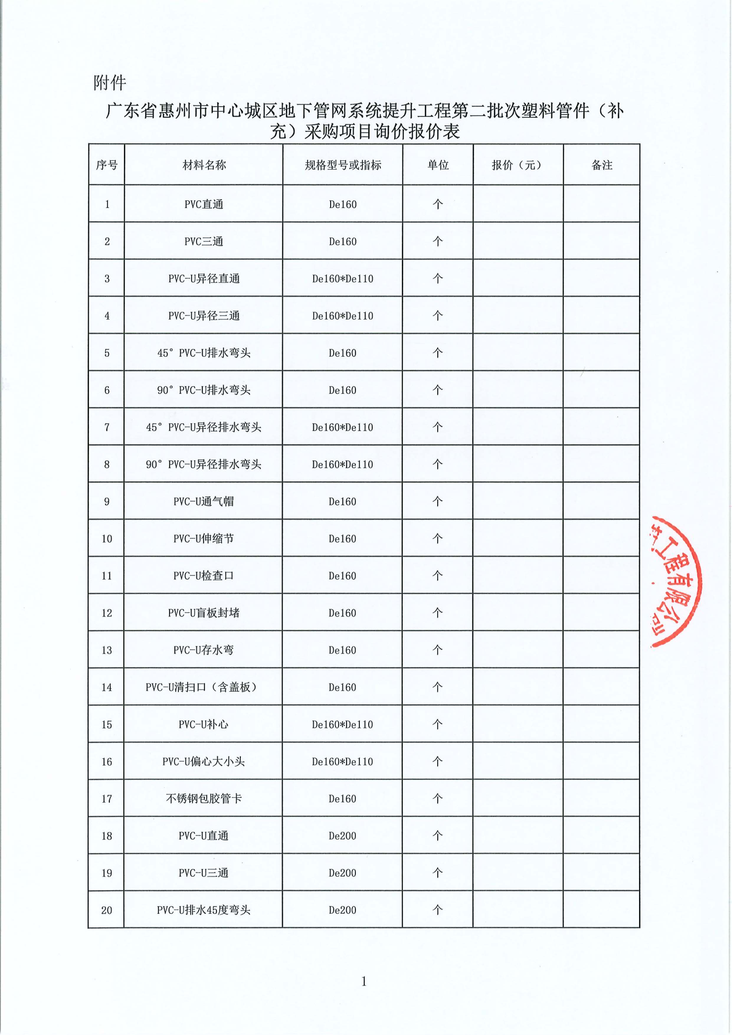 廣東省惠州市中心城區地下管網系統提升工程第二批次塑料管件(補(bǔ)充)採(cǎi)購項目詢價公告附件: